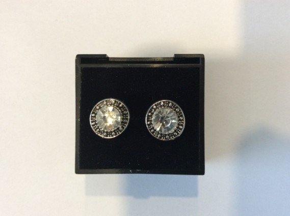 Ørestikker i forsølvet materiale, Rund Ca. Ø 12 mm. Med klar sten. Fremstår som ny.